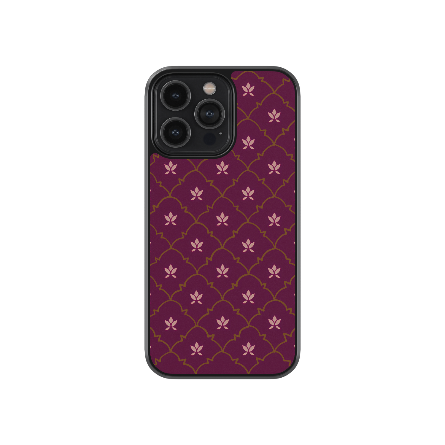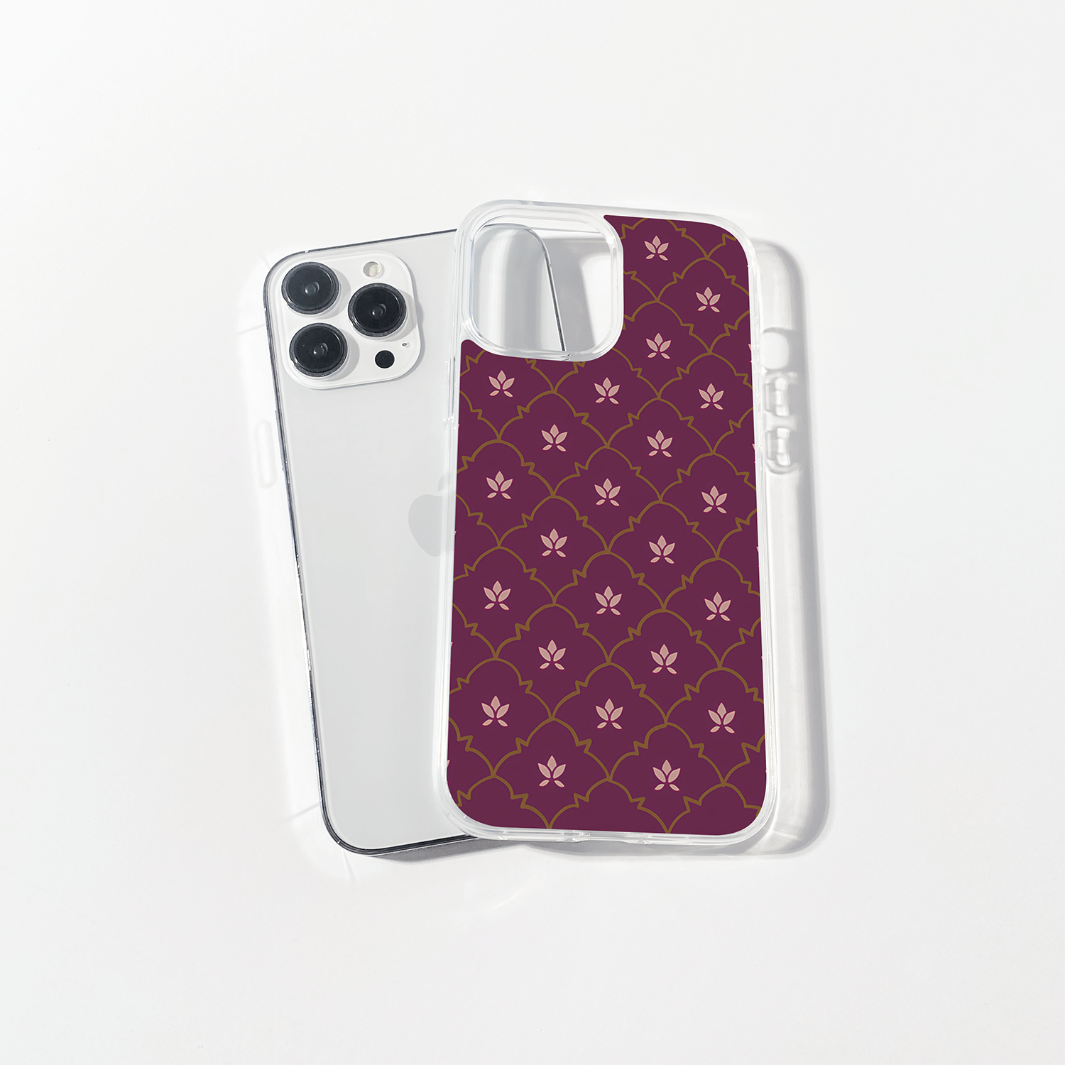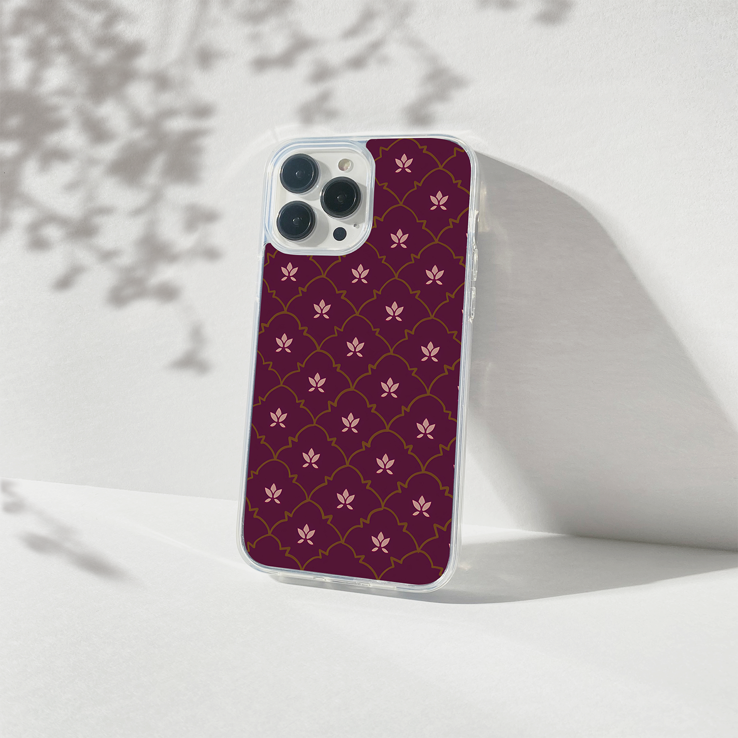 Indulge in regal elegance with this deep maroon phone case featuring intricate gold-outlined floral arches in a timeless lattice pattern—ideal for someone's sophisticated, feminine vibe. Slim and sturdy, it safeguards your phone while adding a touch of luxurious charm. Get yours now!