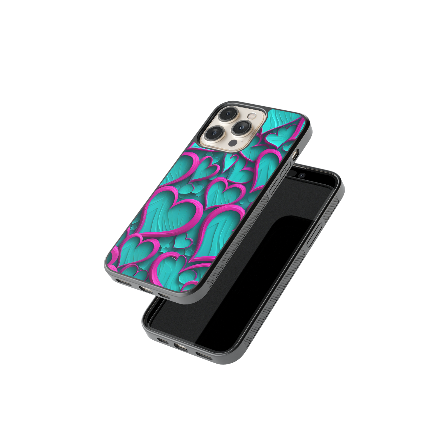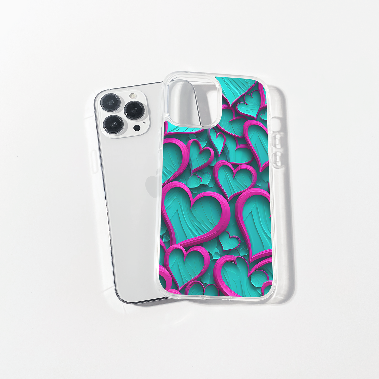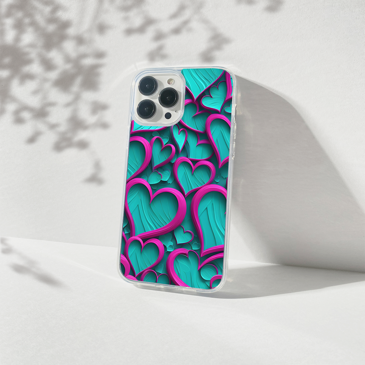 Brighten your phone with this vibrant case featuring a dynamic mix of teal and pink layered hearts with a 3D effect. The bold, playful design brings a modern and energetic vibe, perfect for someone who loves striking, colorful patterns. Get yours now!