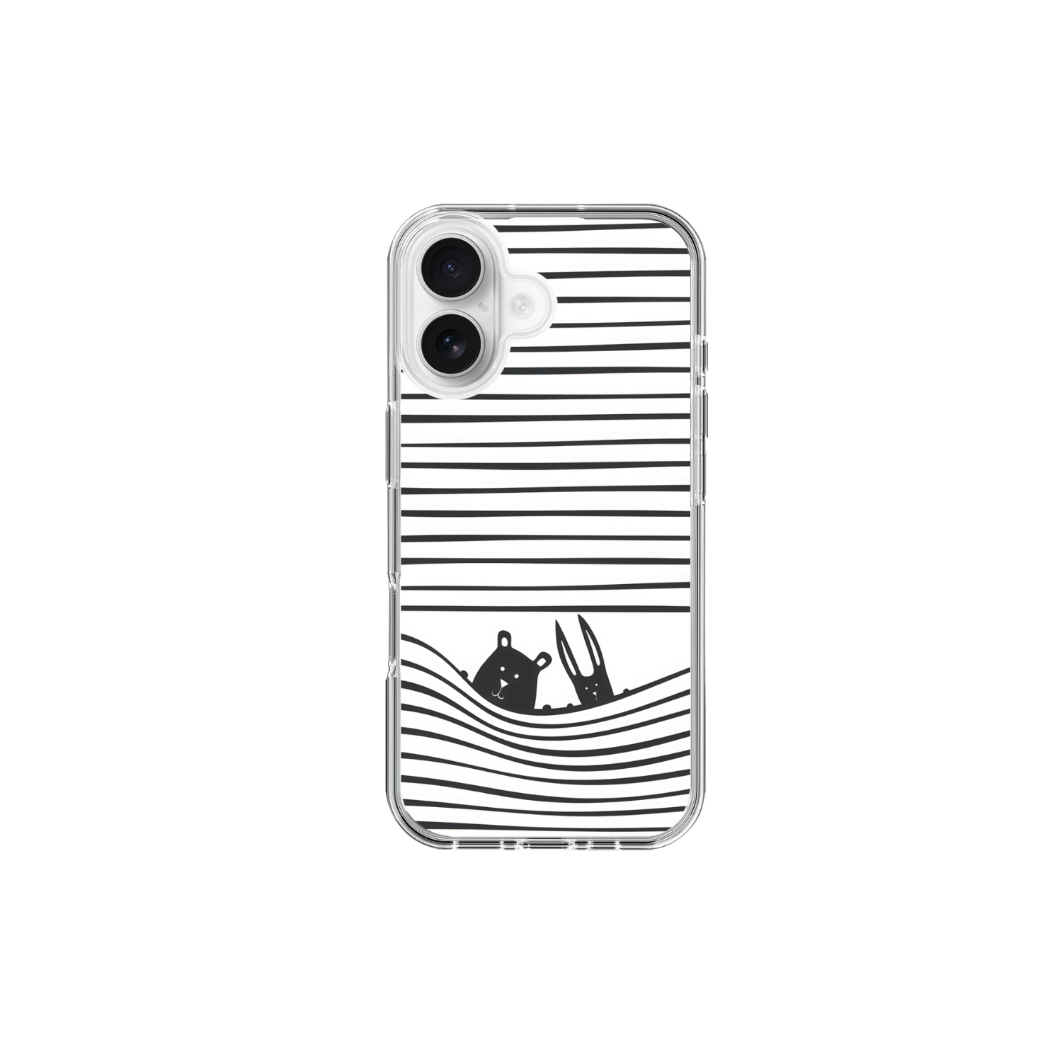 This adorable design showcases a series of bold black horizontal lines with a cute bear and bunny playfully peeking out from the bottom, creating a whimsical and surprising element that's sure to bring a smile every time you glance at your phone. Ideal for someone who loves fun, animal-inspired patterns with a touch of mischief in their accessories. Get yours now!