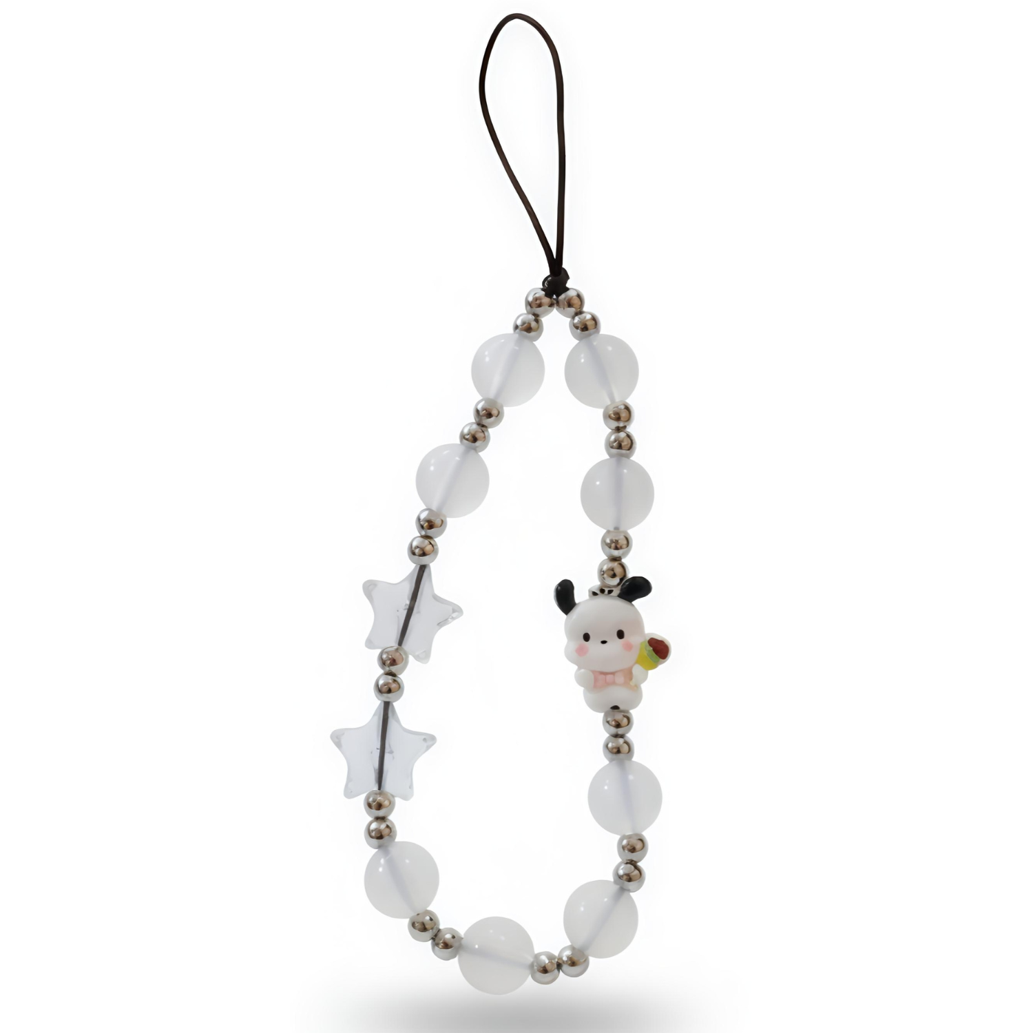 Shimmer with this Pearl Puppy Strawberry Charm! Adorable white pup with rosy cheeks holds a juicy strawberry, accented by glowing pearl beads and twinkly star drops on a silver chain. Perfect kawaii sparkle for someone's phone case. Get yours now!