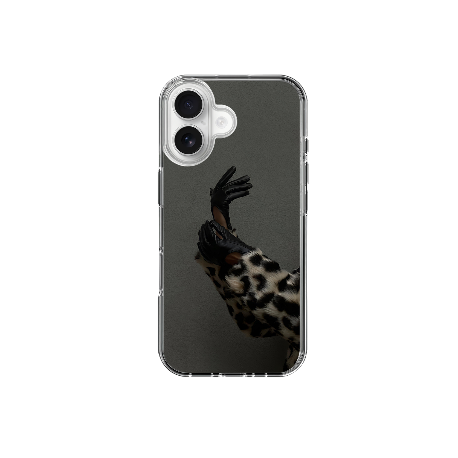 Enhance your phone with this edgy case showcasing a stylish black leather glove against a leopard print sleeve on a sleek gray backdrop. The bold, animal-inspired design with a touch of elegance is perfect for someone who loves daring, fashion-forward styles. Get yours now!